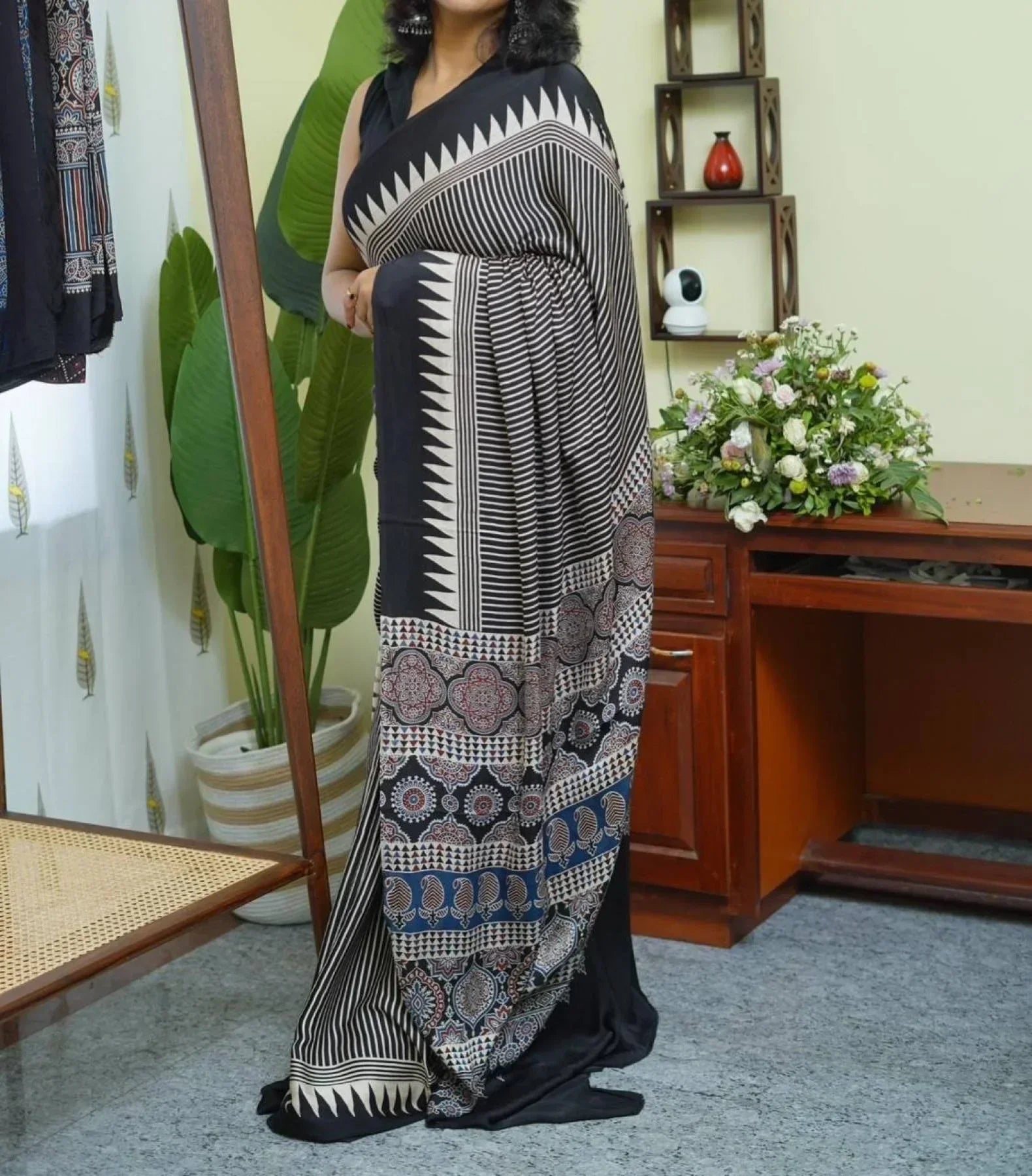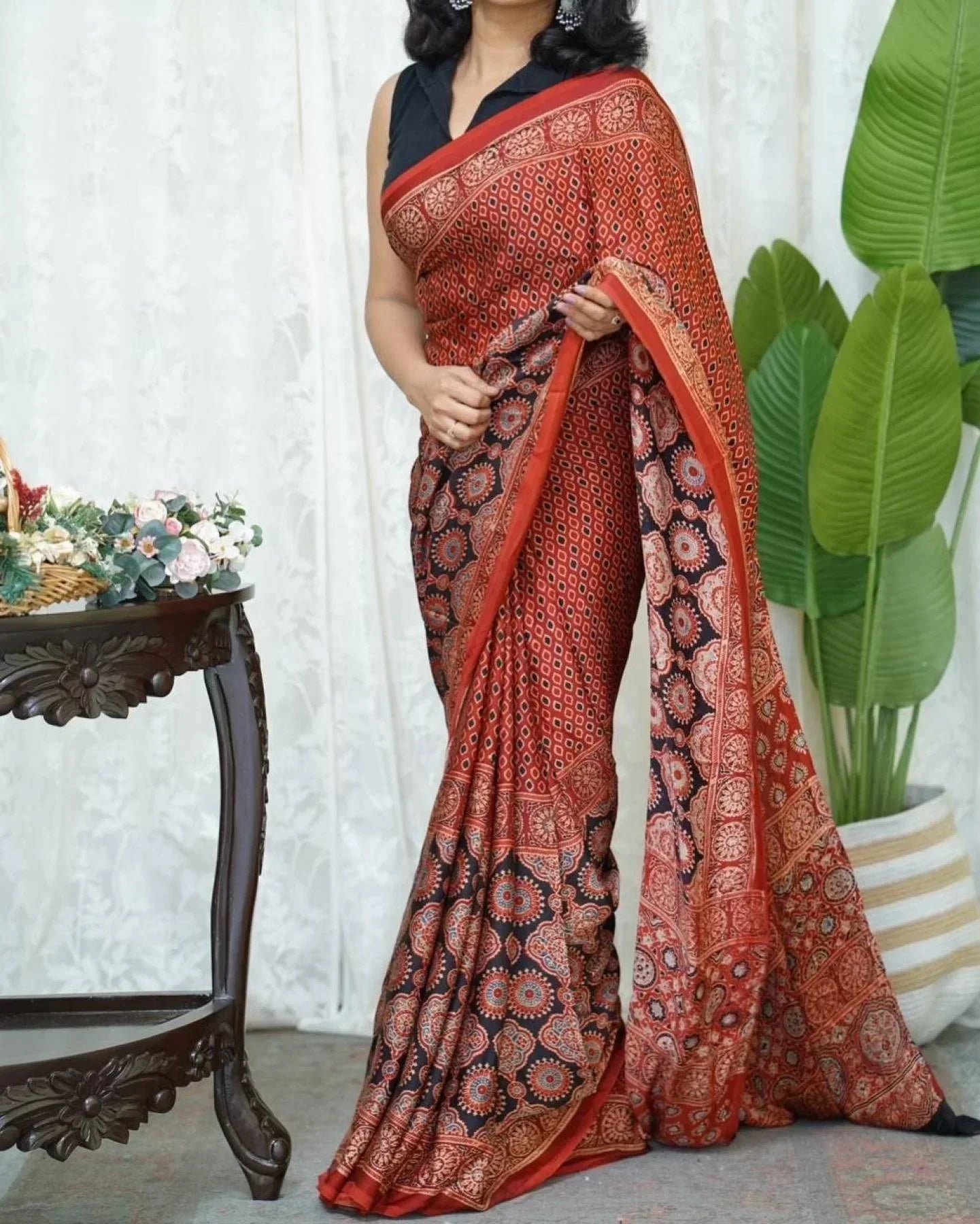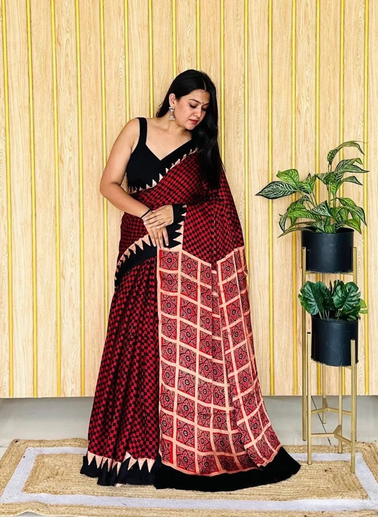 Ajrakh Print Muslin Cotton Sarees With Fumka Pallu At Wholesale Price