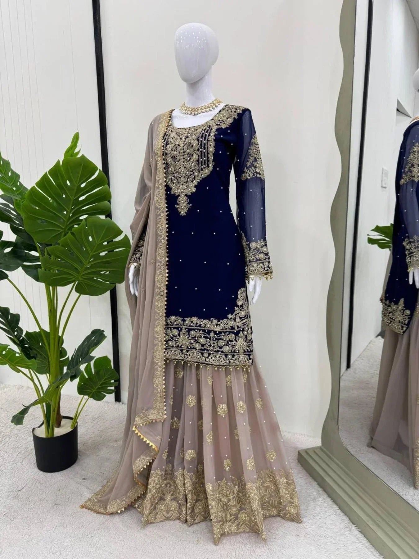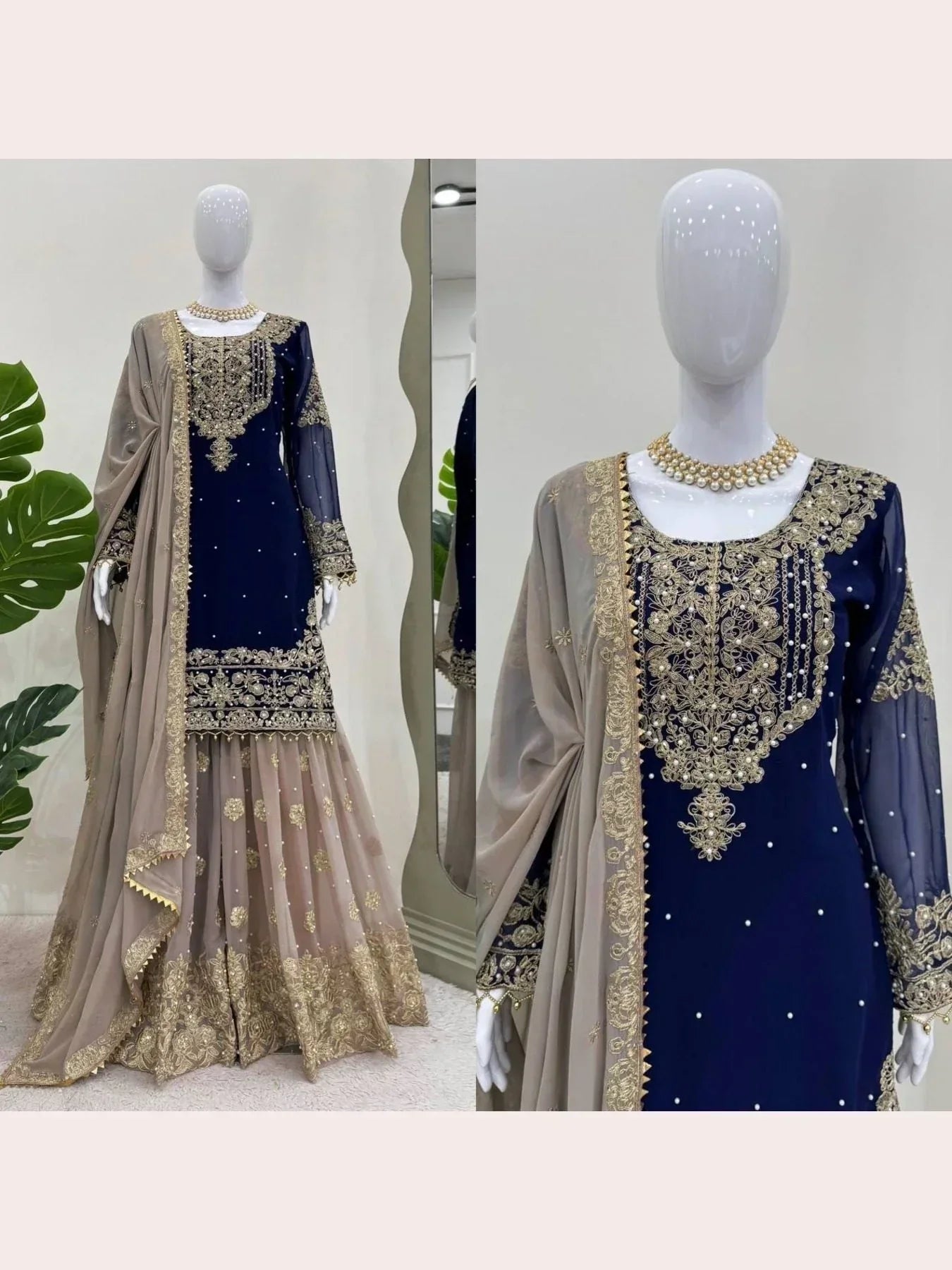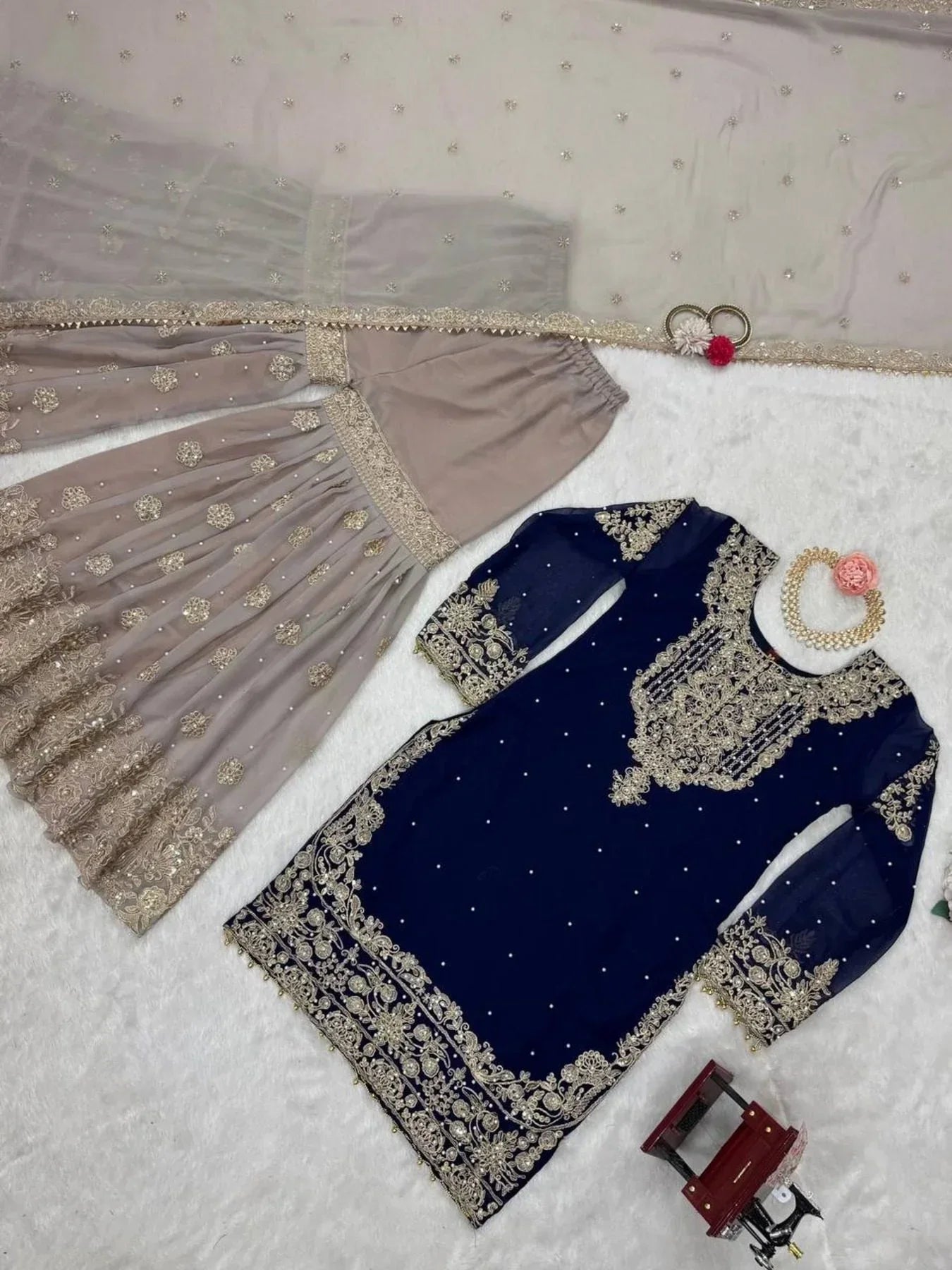 Beautiful Designer Faux Georgette Sequence Blue Sharara Set With Dupatta