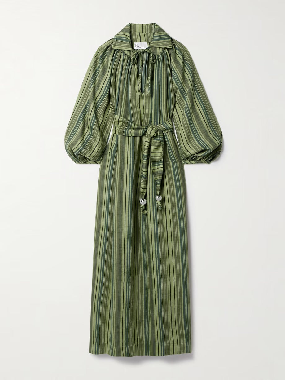 Step into effortless elegance with this Bohemian Green Striped Midi Dress, designed for the modern woman who values both style and comfort. Featuring soft vertical stripes in varying shades of green, this dress creates a visually elongating effect for a flattering look. The flowy silhouette, billowy long sleeves, and adjustable waist belt with tassel accents add a touch of sophistication and bohemian charm.
