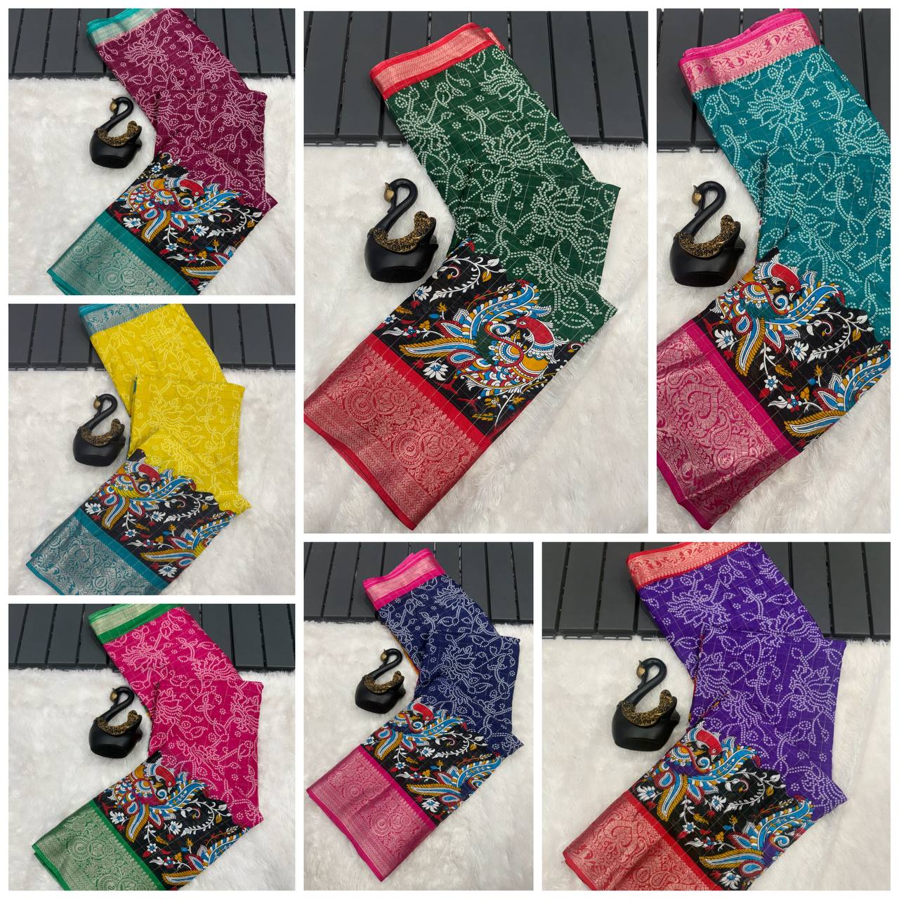 The highlight of the saree is its rich Kalamkari pallu, bringing traditional artistry and vibrant appeal. Paired with a contrast printed blouse, this saree is perfect for women who love easy, graceful styling.